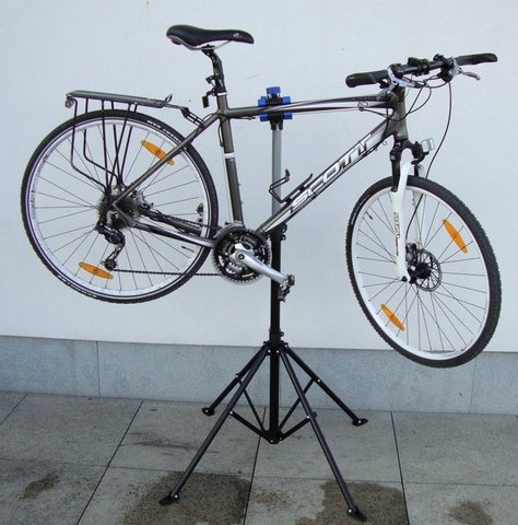 This is a top class, well specified maintenance stand at an excellent price. It is height adjustable with a max clamp head height of 1.65m for even the tallest adult, while also going right down to 1m for kids that want to learn how to repair bikes. These measurements are when the legs are at maximum extension so it can be set even higher. The clamp can attach onto any part of the main frame. Its Pu jaws will hold any frame tube shape and we have tested on the most delicate carbon fibre frames with absolutely no marking at all. The clamp has spaces left to allow free running of "on frame" cables whichever tube you are clamping to. The legs will spread to a max 1.4m x 1.4 m giving great stability. Folding feet allow even better stability on a slightly uneven surface and they are predrilled for permanent fixing. The bike can be tilted and swung in both vertical and horizontal axis for perfect height or position whatever the job. The parts tray has a magnetic strip and loads of tool spaces for anything you want to hand. The adjusting knobs are a very comfortable 50mm diameter and give real purchase to make tightening to any level easy, although care should always be taken to avoid over-tightening on very light frames. The stand comes with an extendable front wheel clamp that clamps the front wheel either to the rest of the bike or the repair stand. The product has been very well received by our customers, as can be seen by the excellent feedback we are getting at https://sellercentral.amazon.co.uk/gp/feedback-manager/home.html/ref=ag_feedback_dnav_custmetric_T1
